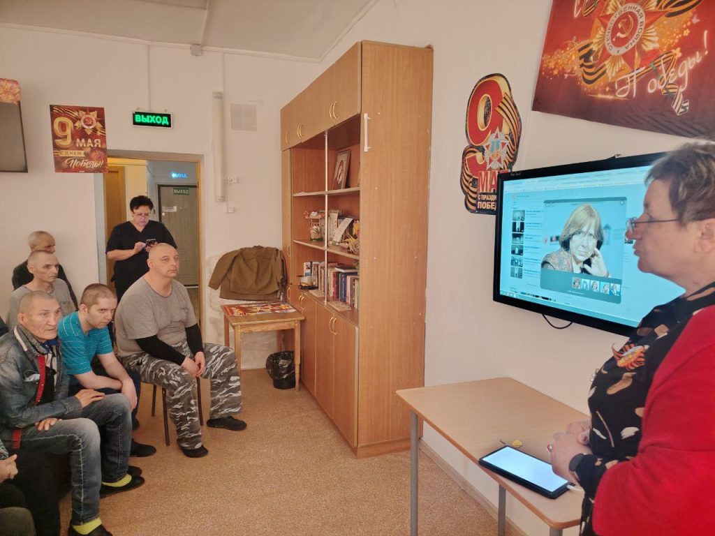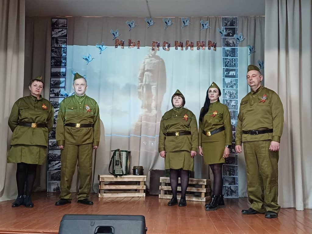 Участники мероприятия познакомились с видео роликом о создателях самых известных песен времен войны. А также с удовольствием пели военные песни: «В землянке», «Темная ночь», «Журавли» и многие другие песни. Посмотрели отрывки военных фильмов «Два бойца», «Небесный тихоход», «Белорусский вокзал», «Жди меня» и др.