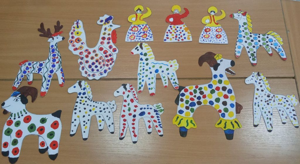 Получатели социальных проявили фантазию и яркими цветами украсили персонажей двмковской игрушки.