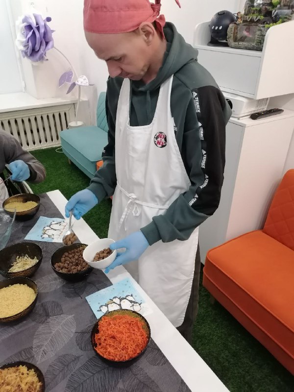 В рамках реализации практики «Кулинарный клуб», специалист по соц. работе (руководитель клуба) КГБУСО «Арсеньевский ПНИ» Гайфулина Е.В., совместно со специалистом по соц. работе Мягковым А.В., провела с проживающими интерната мастер-класс по приготовлению сухого супа с фрикадельками, для участников СВО.